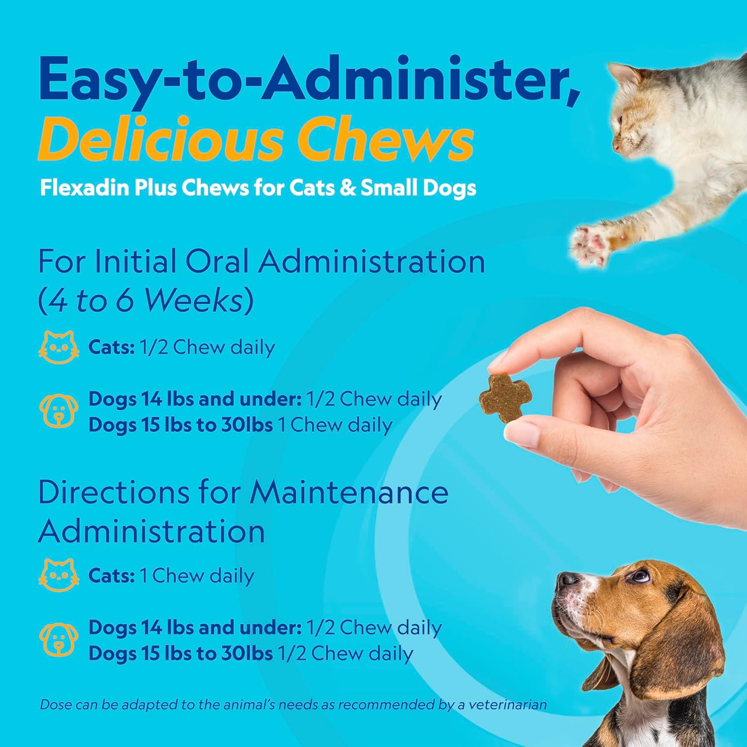 Everyday Pet Wellness: This bag includes 90 daily chews to support joint health for your dog or cat; administer half a chew daily to cats and dogs under 14 lb, and one chew daily to dogs between 15 and 30 lb