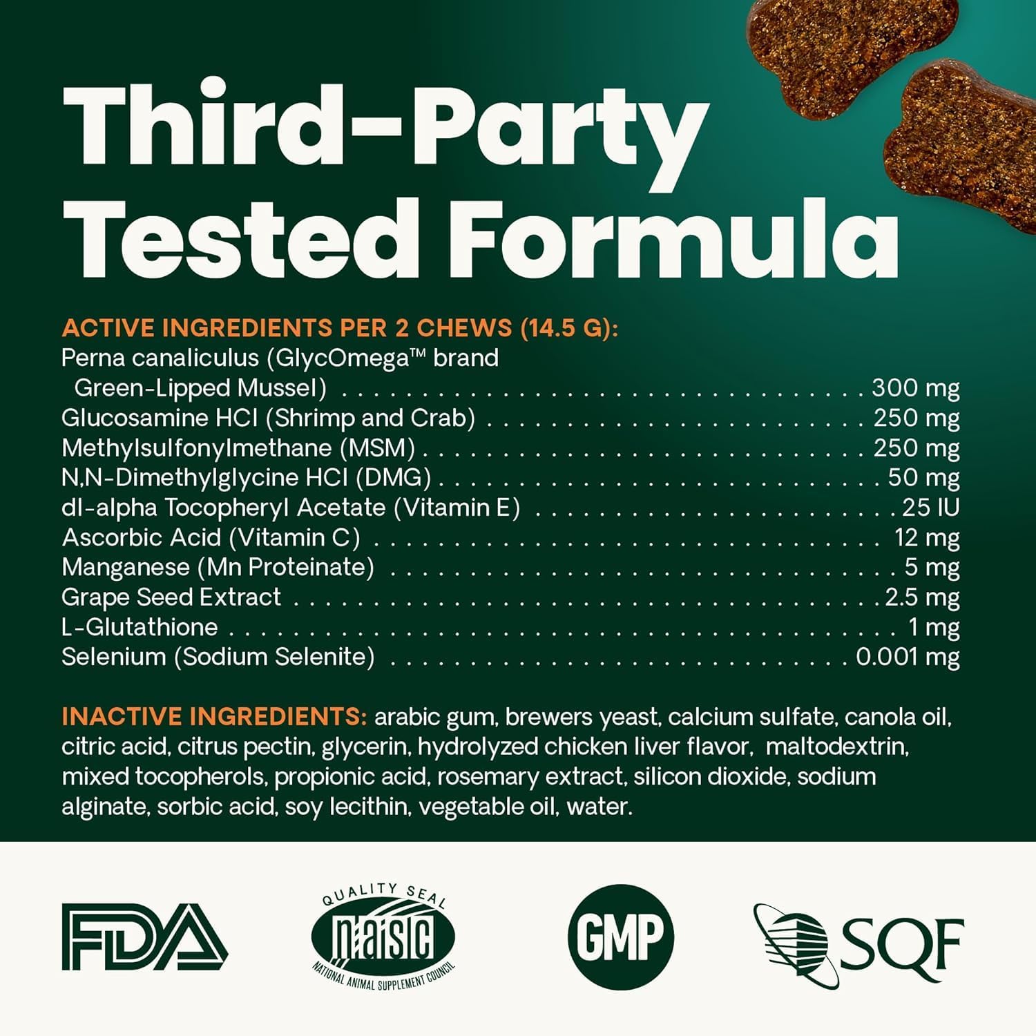 High-Quality Ingredients: Our vet-formulated dog joint supplements are certified by the National Animal Supplement Council (NASC), routinely undergo third-party testing, and contain no hidden ingredients, artificial flavors, or synthetic colors
