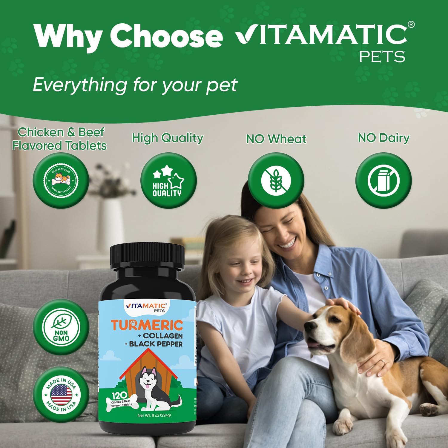 Vitamatic Turmeric for Dogs – 120 Chewable Tablets – Anti-Inflammatory Pain Relief with Curcumin, Collagen & Black Pepper – Hip & Joint Support for Dogs