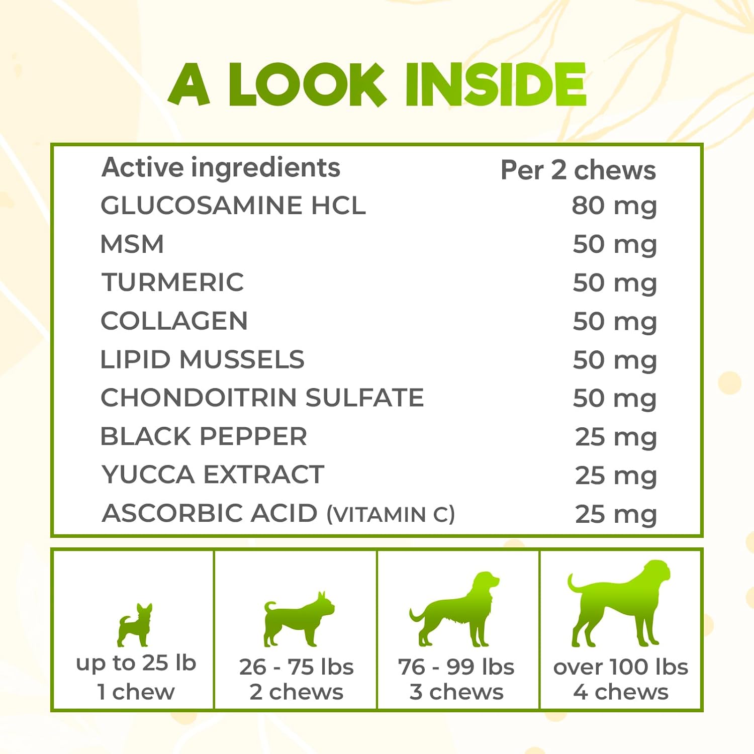 🍃 NATURAL INGREDIENTS, SAFE AND SOUND: Our bone and joint supplement for dogs are packed with premium ingredients including Turmeric, Mojave yucca, Green Lipped Mussel, Black Pepper, Vitamin C and Premium blend of Glucosamine HCL, MSM, Collagen & Chondroitin. These chews offer natural, safe, and effective hip and joint support for your dog.