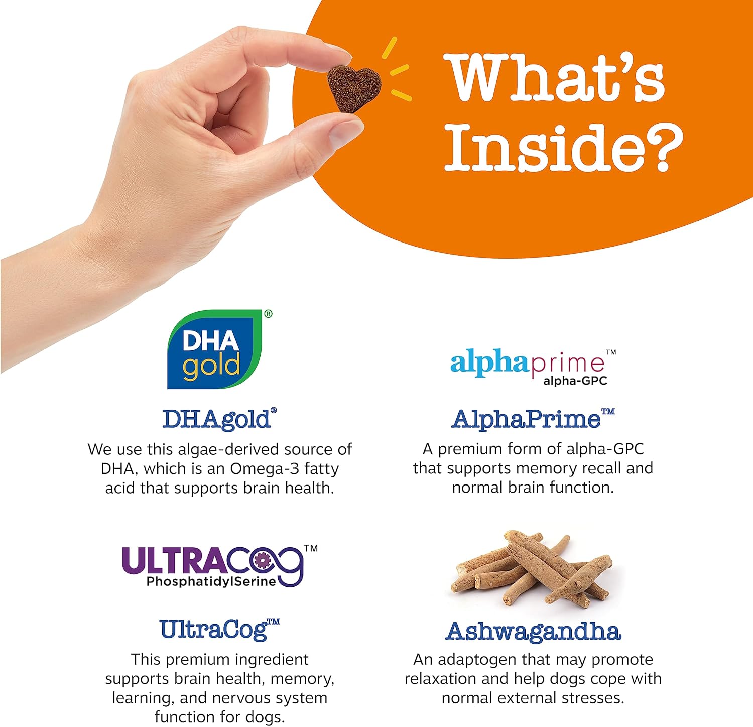 Product Overview Premium Ashwagandha Omega-3 DHA Fatty Acid Promotes Brain Health Supports Memory Recall Promotes Calmness & Relaxation For Senior & Adult Dogs Delicious Chicken Flavor